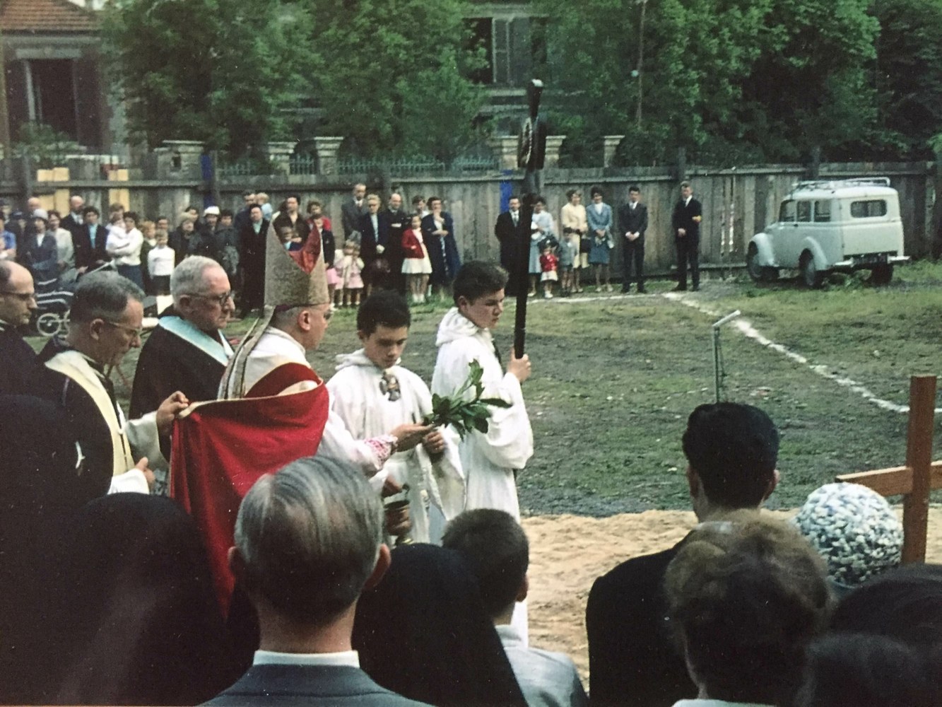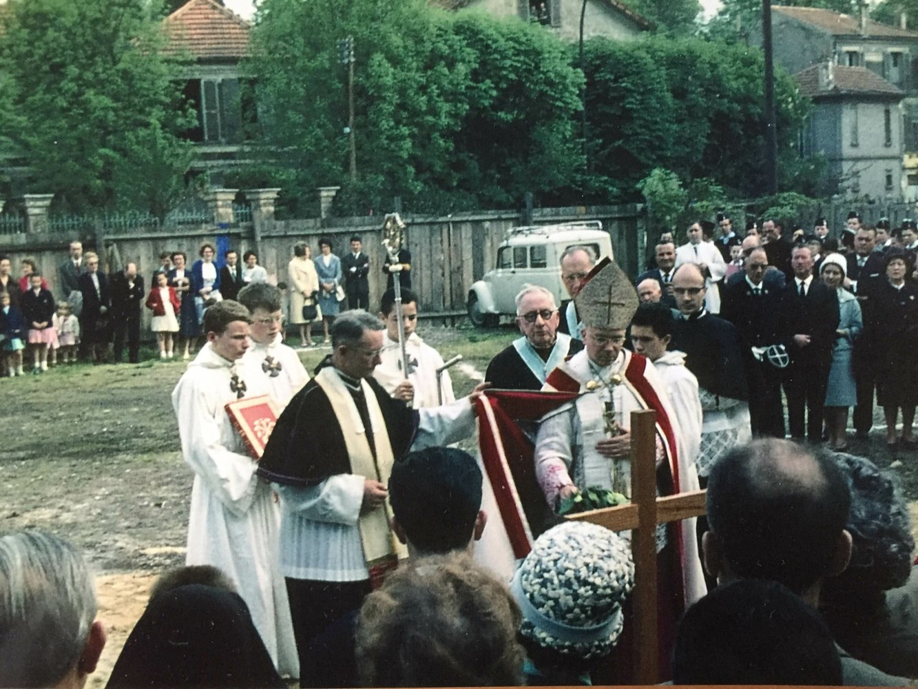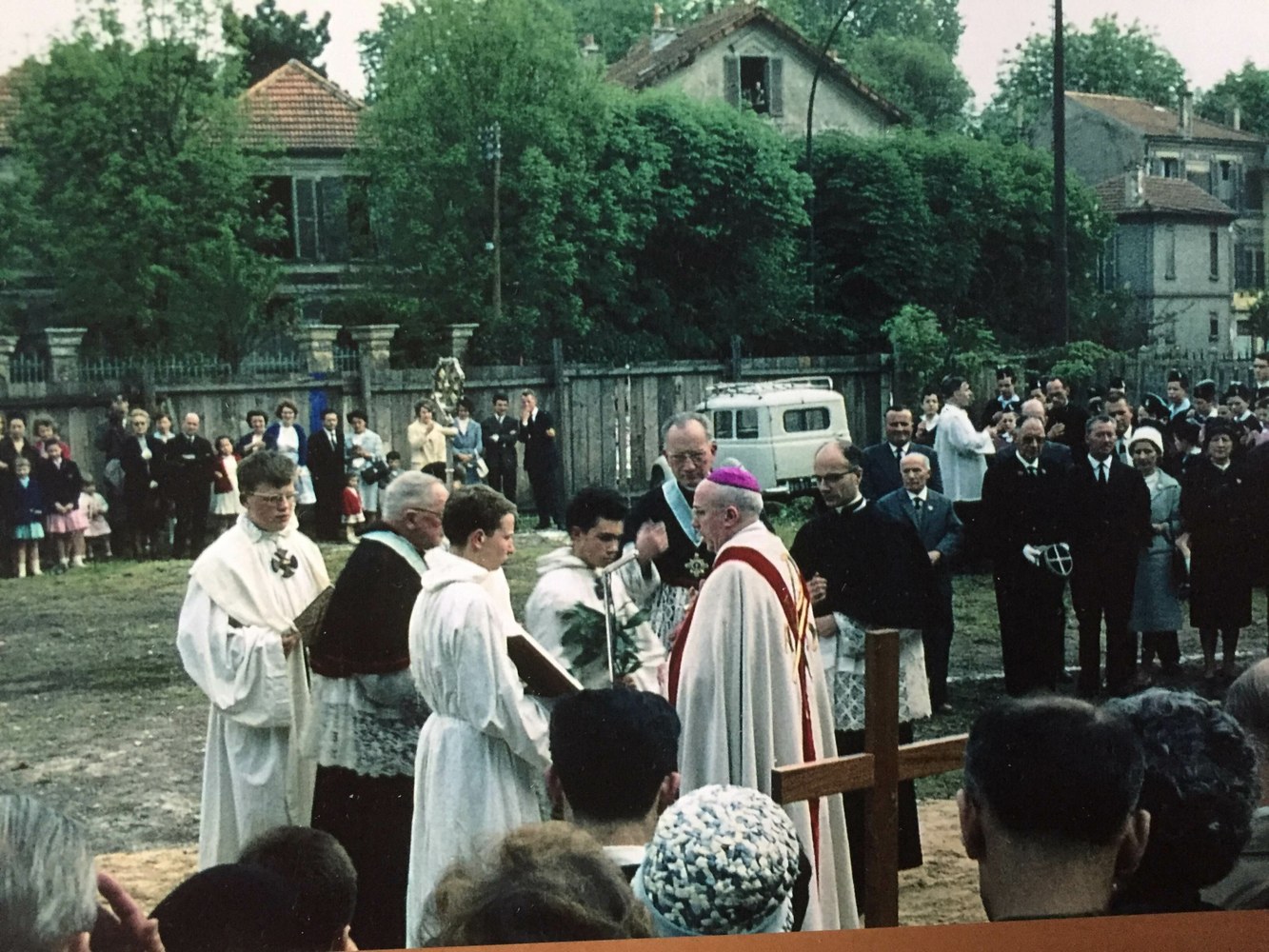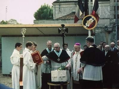 "Pose de la première pierre de la chapelle Notre-Dame du Val - le 26 mai 1963."